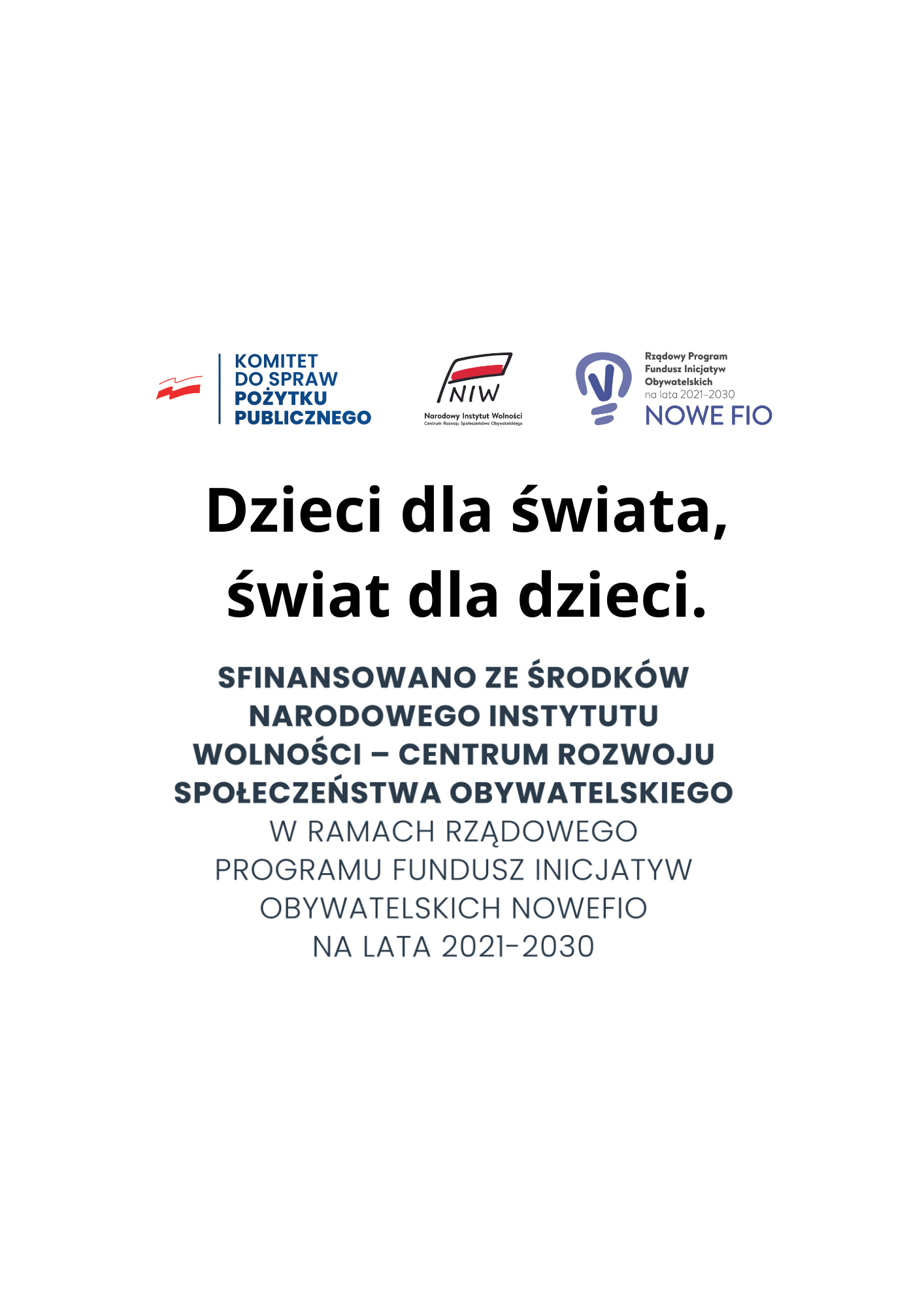 Fundacja Widzieć Marzenia realizuje zadanie publiczne pod tytułem „Dzieci dla świata, świat dla dzieci” sfinansowane ze środków Narodowego Instytutu Wolności – Centrum Rozwoju Społeczeństwa Obywatelskiego w ramach Rządowego Programu FUNDUSZ INICJATYW OBYWATELSKICH NOWEFIO na lata 2021-2030.